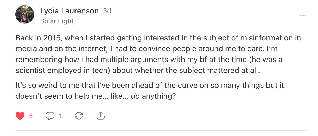 Back in 2015, when I started getting interested in the subject of misinformation in media and on the internet, I had to convince people around me to care. I’m remembering how I had multiple arguments with my bf at the time (he was a scientist employed in tech) about whether the subject mattered at all.